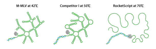 Note: Schematic representation of the 5’UTR of a gene, with complex secondary structure, at three different temperatures. Note that RocketScript shows full activity at 70°C allowing it to synthesize the whole length of several gene sequences which M-MLV and other reverse transcriptases fail to synthesize.