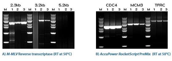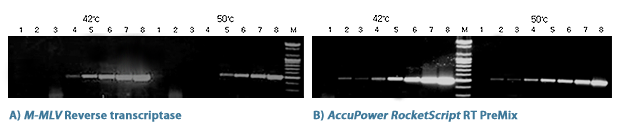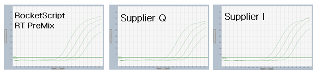 Figure 2. Comparison of amplification efficiency between AccuPower® RocketScript™ RT PreMix and competitors M-MLV RTase.