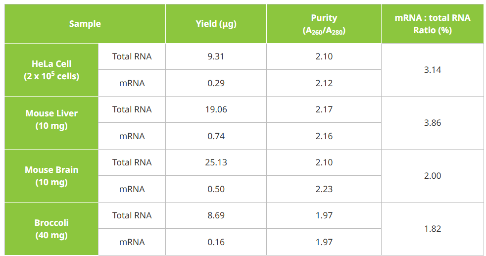 RNA yield (µg) and purity (A260/A280) were measured with a spectrophotometer. The mRNA ratio in total RNA (%) was calculated from the proportion of mRNA yield relative to total RNA yield. Samples tested included HeLa cells (2 10 cells), mouse liver (10 mg), mouse brain (10 mg), and broccoli (40 mg).