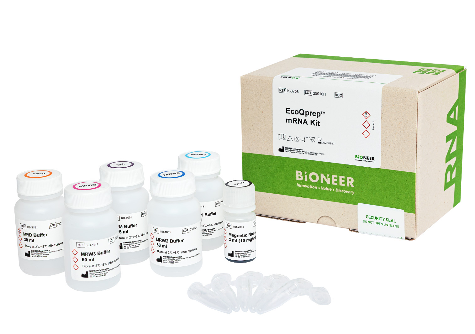 EcoQprep™ mRNA Kit   [K-3708]EcoQprep™ mRNA Kit is a magnetic beadbased system for isolating high-quality mRNA with poly(A) tails from cultured cells, animal tissues, and plant tissues. Using oligo(dT) magnetic nanobeads and the EcoQprep™ Magnetic Separation Rack, the kit provides a faster and simpler workflow than traditional spin column methods. Because it does not require centrifugation, it reduces energy use and plastic waste. The purified mRNA is ready for downstream applications such as RT-PCR, RT-qPCR, cDNA synthesis, and gene cloning.